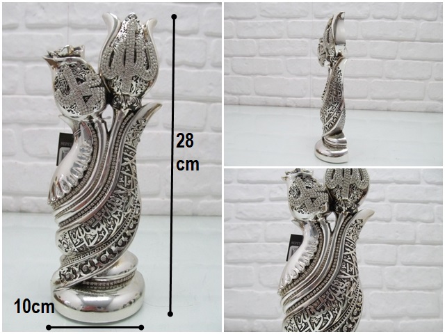 sd36152 gül lale dekorlu kelimei tevhid ve ALLAH MUHAMMED yazılı gümüş boyalı döküm polyester obje