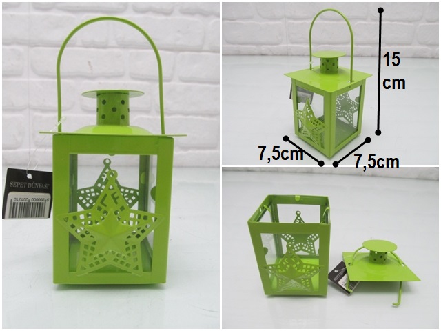 sd44266 yeşil metal yıldız dekorlu camlı mumluk fener