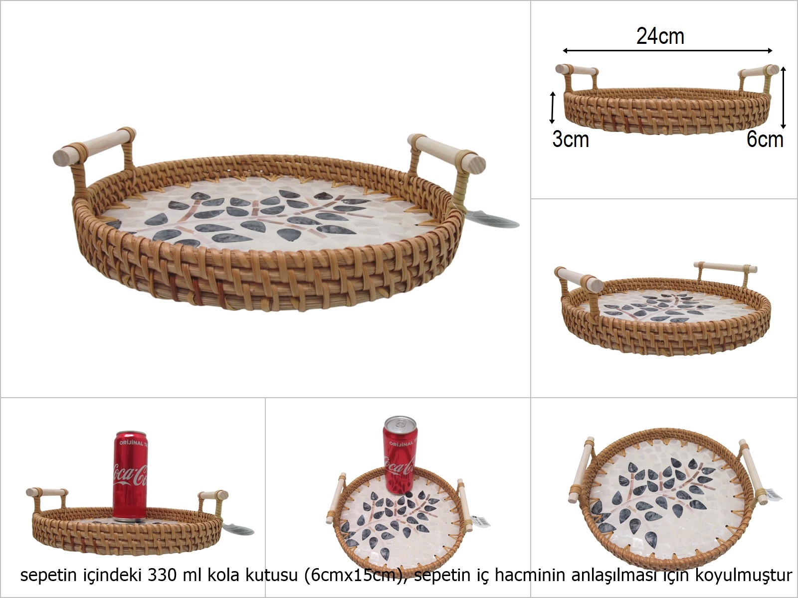 sd51004 rattan çerçeveli sedef tabanlı no2 ahşap kulplu desenli dekoratif tepsi