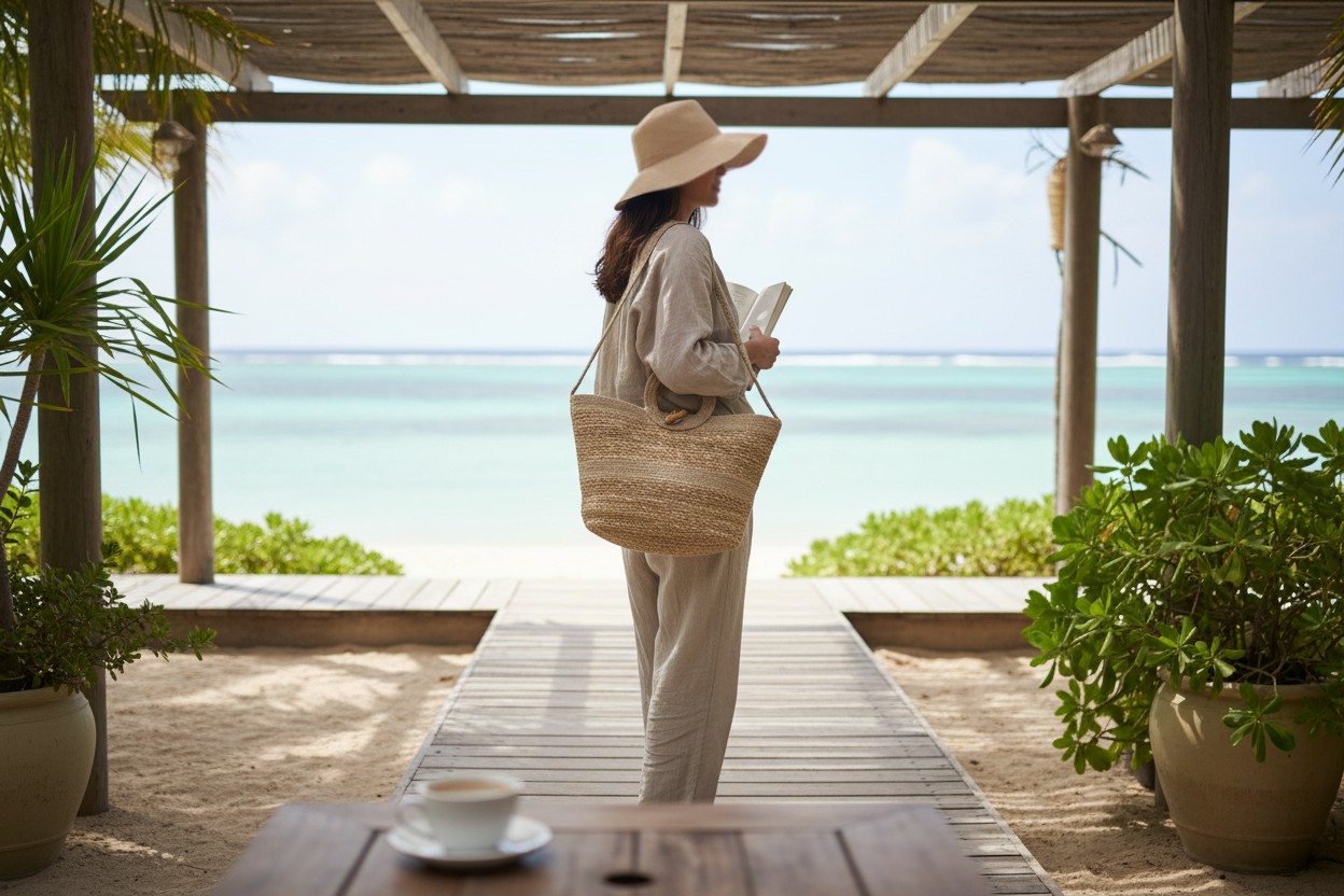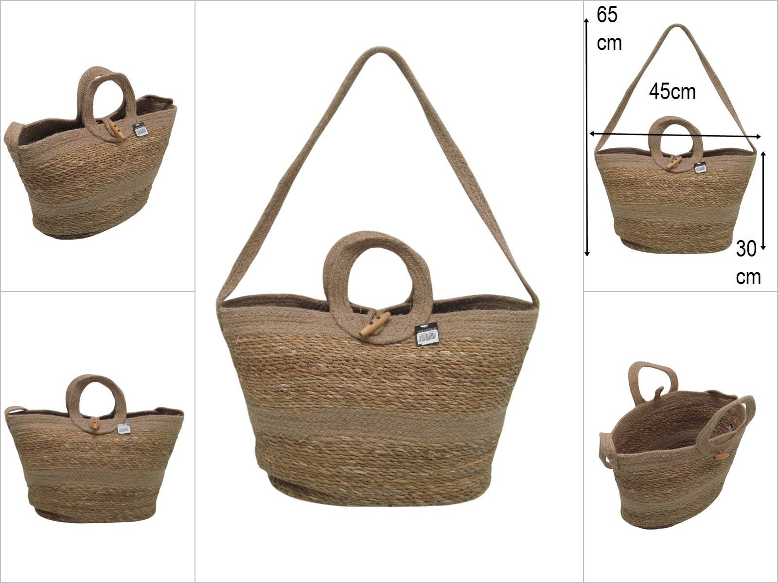 sd52945 bej pamuk ip dekorlu kulplu askılı hasır çanta